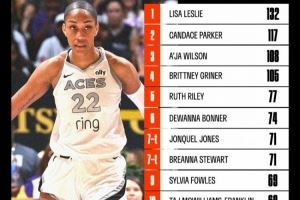 阿贾-威尔逊生涯季后赛盖帽数达108个 超越格里娜独占WNBA历史第3